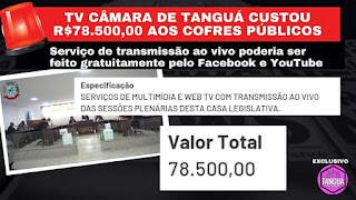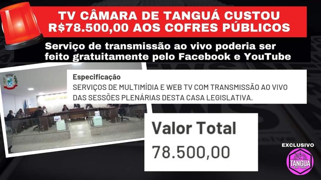A presidente do Parlamento da pobre cidadezinha de TANGUÁ, a vereadora Aline Pereira, contratou a empresa 4Four Comércio e serviços, para transmitir as sessões legislativas via internet. O argumento da despesa foi a criação da “TV CÂMARA”, que nada mais é que uma transmissão ao vivo pelo Facebook e YouTube, serviço oferecido gratuitamente por essas plataformas e que não condiz com o valor pago de 78 mil reais. Pois, qualquer um pode fazer com um celular e uma boa internet.