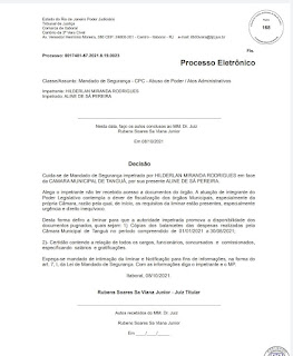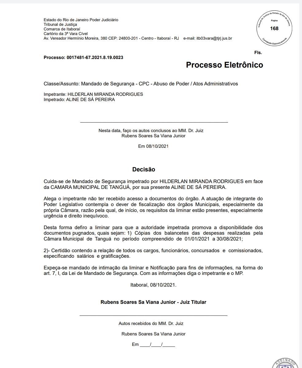O vereador Derlan (Hilderlam Miranda) foi o primeiro a 3 meses, a protocolar um pedido para ter acesso a um balancete completo, com as Gratificações, nomeações e contratos de empresas, nesses 8 primeiros meses da Câmara de Vereadores. Como não foi atendido, teve que solicitar apoio judicial contra a Presidente Aline Pereira, onde a justiça determinou que ela forneça o balancete imediatamente. Não sabemos se ela recorreu para não dá, ou cumpriu a ordem judicial.