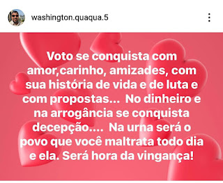 Conforme fontes, uma das publicações irritou profundamente o PREFEITO Horta, quando QUAQUÁ diz: ” A comunidade do Pindobas e do Caxito estão solicitando a finalização das obras de ligação dos dois bairros, e a retomada das equipes de asfalto que pararam” … Não precisava expor o governo ao ridículo, o que prova que Horta não obedece mais QUAQUÁ, já que antes bastava um telefonema entre eles. Aliás, QUAQUÁ já foi Prefeito e não fez o que exige agora….