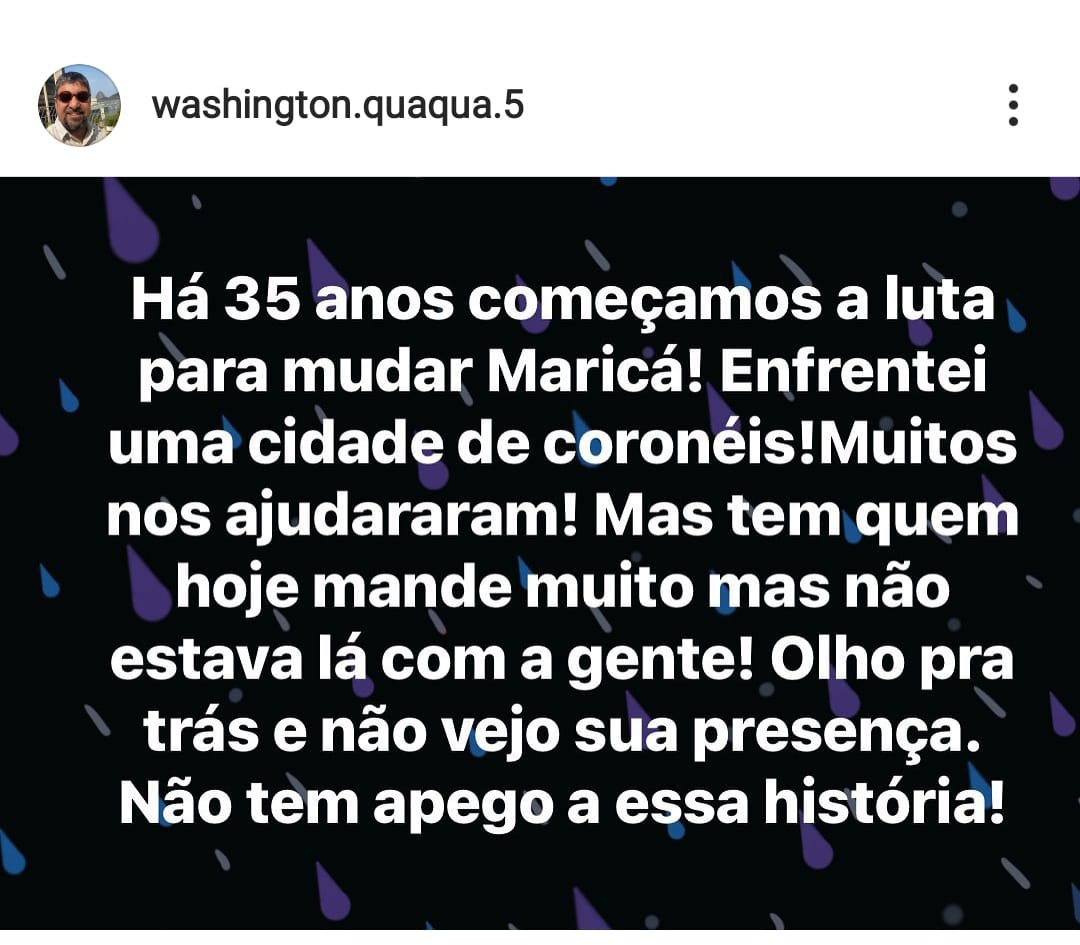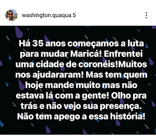 Não dá para entender o ex-prefeito QUAQUÁ nas redes sociais, parece está atacando o Prefeito Fabiano Horta. Se entende como se Horta estivesse roendo o cordão umbilical. As críticas sempre subliminares demostram que as coisas não estão como aparentam no reino do PT em Maricá.
